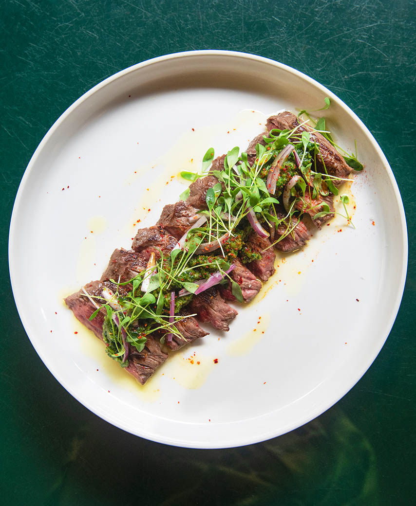 • Kruid de onglet met zout en laat hem 20 minuten op kamertemperatuur komen.